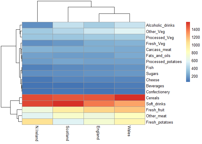 Q6. Based on the pairs and heatmap figures, which countries cluster together and what does this suggest about their food consumption patterns? Can you easily tell what the main differences between N. Ireland and the other countries of the UK in terms of this data-set?