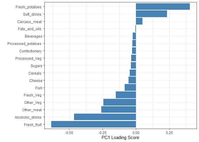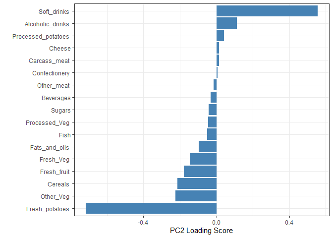 Q9. Generate a similar ‘loadings plot’ for PC2. What two food groups feature prominantely and what does PC2 mainly tell us about?