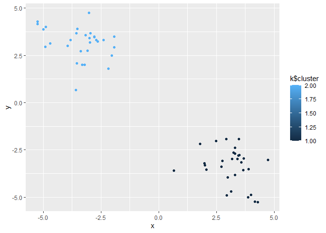 ggplot(z) + aes(x, y, color=k$cluster) + geom_point()