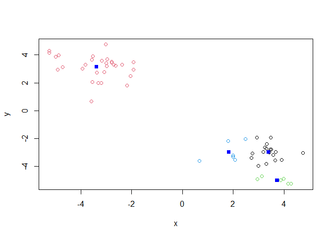 points(k$centers, col="blue", pch=15)