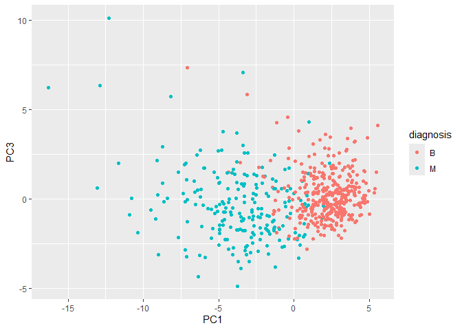 ggplot(wisc.pr$x) + aes(PC1, PC3, color = diagnosis) + geom_point()