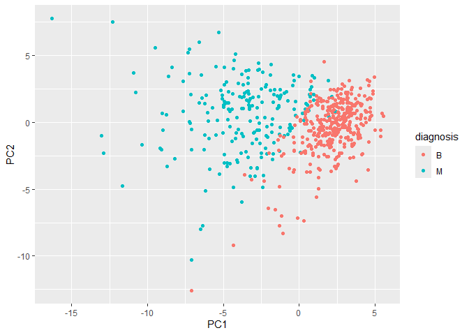 ggplot(wisc.pr$x) + aes(PC1, PC2, color = diagnosis) + geom_point()